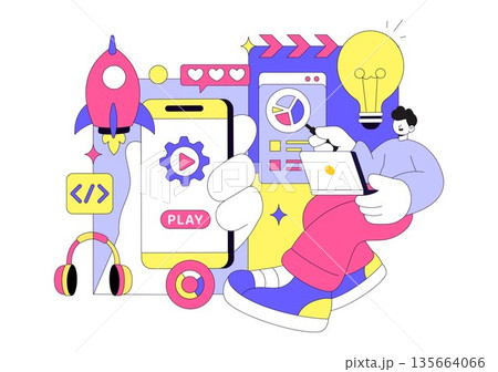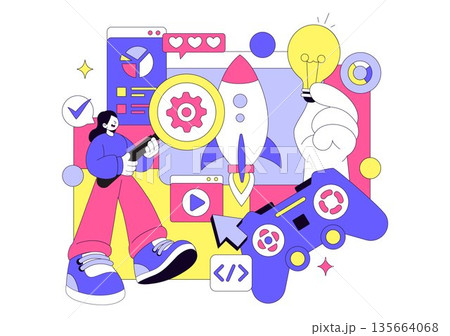 Game Development Vector Illustration Featuring Games, Digital Technology, Programming, and Coding for the Technical Aspects of Creating Video Games