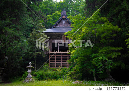 清晨,赤木山長明寺正殿及寺院庭院的景色。