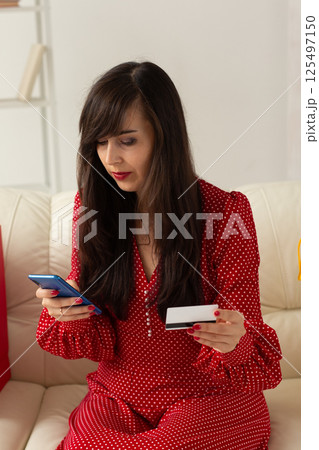 Woman make shopping with phone and card in hand sitting on sofa. Concept of e-commerce and modern consumer behavior. Copy space