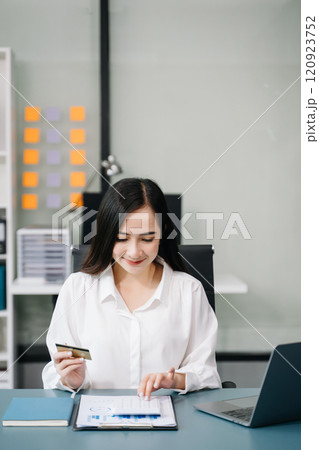 Corporate and business. Asian woman in office, holds smartphone and credit card, paying online, setting up direct debit online, white background