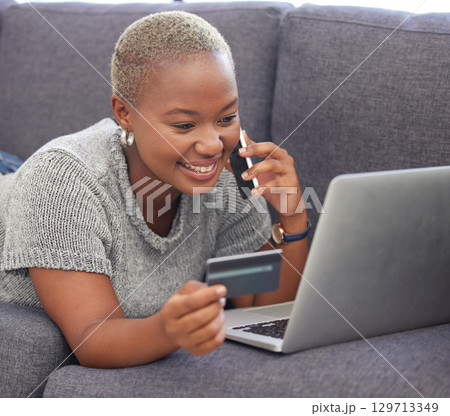 Phone call, credit card and black woman on laptop for bank communication online with satisfied smile. Finance loan application approval and phone update for happy girl at home in South Africa.