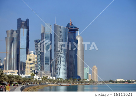卡達多哈濱海路的晨景 — — 單桅帆船與現代天際線