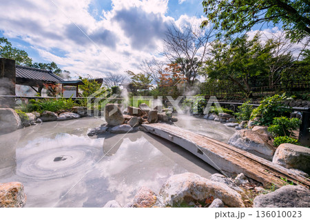 Oniishibozu Jigoku hot spring in autumn with skyline reflect, Beppu