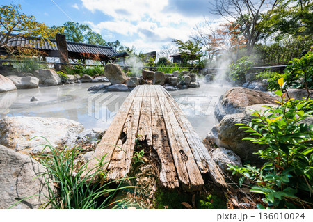Wooden bridge to Oniishibozu Jigoku hot spring in autumn, Beppu