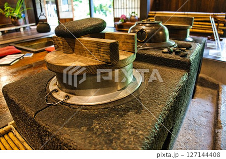 日本老房子髒地板廚房裡的烤箱裡煮著美味的米飯
