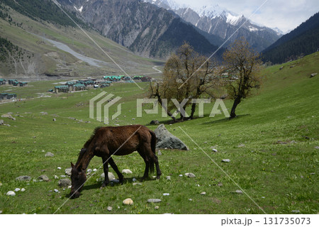 Horse graze in a grassy field in Sonamarg, a valley and a major tourist attraction in the Indian state of Jammu and Kashmir. Known as the "field of gold", it is the starting point for many Himalayan.