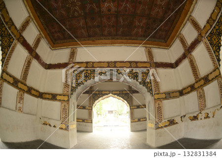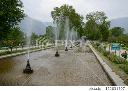 The interior of the Shalimar Bagh Gardens, a beautiful Mughal garden in Srinagar, Jammu and Kashmir, India, is decorated with fountains, ponds and a variety of plants.