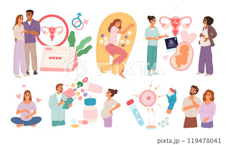 Human fertilization. Conception and pregnancy preparation. Parents couple at appointment with doctors. Gynecological consultation. Ovulation period. Pregnant woman. Garish vector set