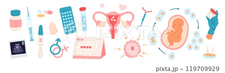 People fertility. Artificial insemination. Child conception. Gynecology and obstetrics elements. Reproductive function. Prenatal examining. Ultrasonic diagnostics. Garish vector set