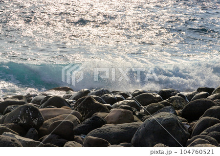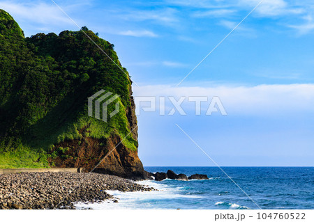 A rocky coastline with a steep cliff overgrown with pine trees leading to a pebble-strewn beach. The sky is partly clouded and the ocean is calm. Tree trunks and rubbish are scattered on wild beach.