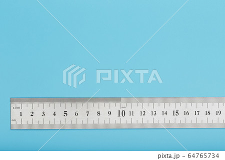 A metal ruler with a scale on a blue background is