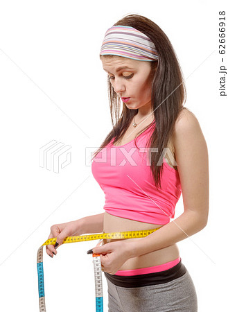 Concept of healthy eating. Fitness woman measuring waist