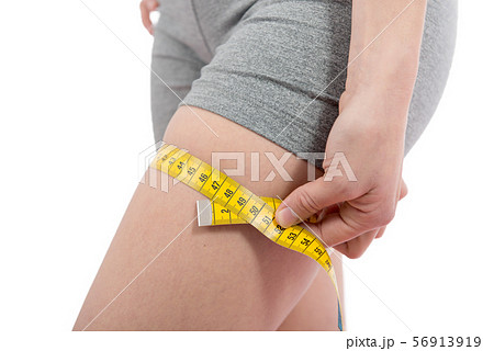 young woman is measuring her thigh