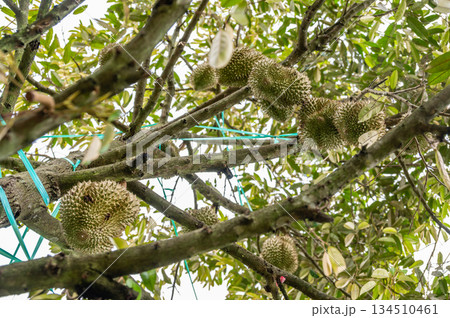 Durian growing on durian tree in Thailand. Durian is a Southeast Asian fruit that's most popular in Thailand.