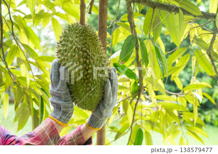 Cropped shot view of farmer hands touching a durian before harvesting. Durian is a Southeast Asian fruit that's most popular in Thailand.