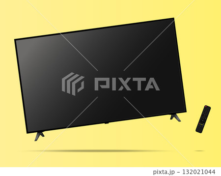 TV screen with remote control floated on yellow background