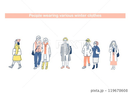 一組扁平插畫,描繪了一對友善的男女身著冬裝,在雪天漫步。