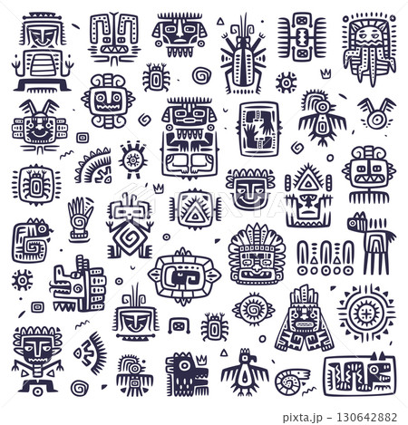 Mexican gods symbols. Abstract aztec animal bird totem idols, ancient inca maya civilization primitive traditional signs. Vector collection