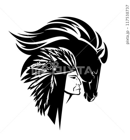 native american chief and mustang horse spirit black and white vector head portrait
