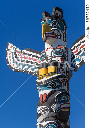 Traditional religious totem pole with decorated tribal masks and eagle vector icon, Aztecs Mayans native ethnic culture
