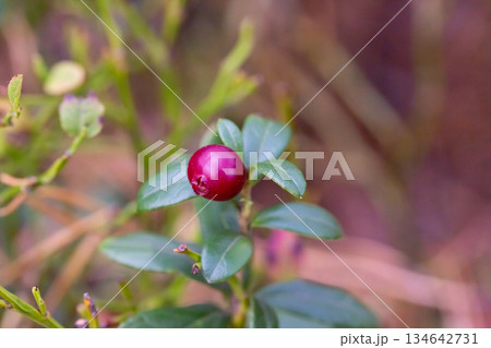 Small green wild cowberry bushes with red mature