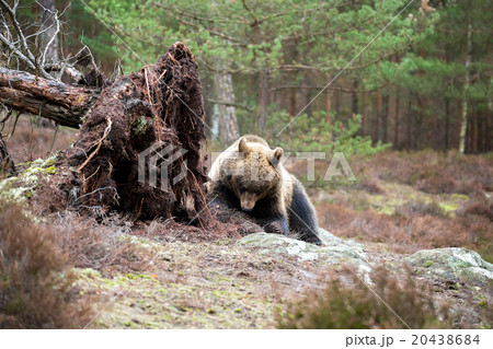 A large brown bear lies in the autumn forest.