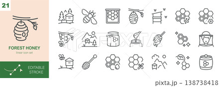 Forest Honey Vector Icons Set. Wild Beekeeping, Natural Hive and Honeycomb, Organic Forest Nectar Symbols. Isolated Editable Stroke Linear Collection.