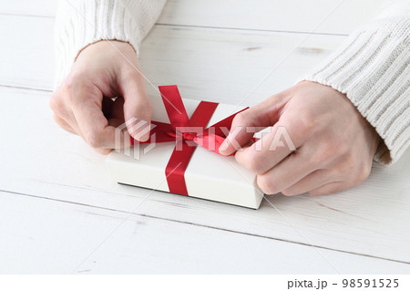 Saint Nicholas decorates a festive present box in his North Pole workshop, preparing wrapped gifts for delivery to children on Christmas eve. Colorful ornaments fill the holiday with magic. Close up.