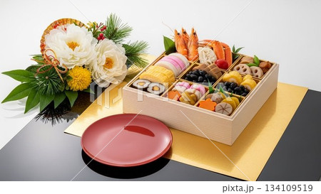 豐盛的新年大餐盛放在白色木盒中,擺放在黑色漆桌上,旁邊還配有新年裝飾品。