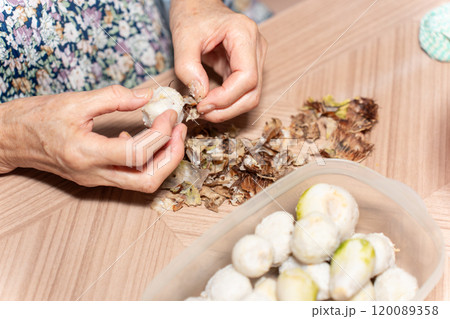 一隻女人的手正在用削皮器削馬鈴薯皮。
