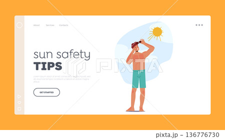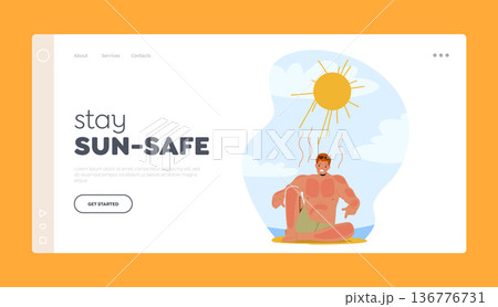 Sun Safety Tips Landing Page Template. Man Experiences Painful Sunburn On The Beach, Resulting In Redness, Itching