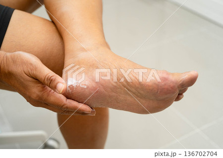 Asian woman check feet with crack and dry heel skin, Diabetic Foot.