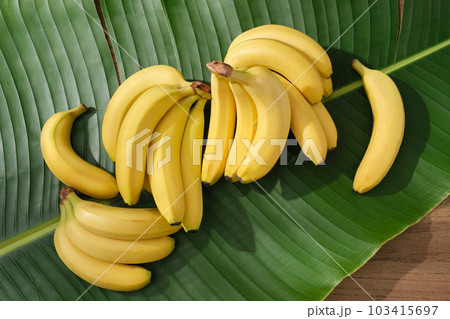 Yellow banana bunches arranged on fresh green banana leaf. Banana (Musaceae) is loaded with many nutrients that help to give you a healthy looking skin
