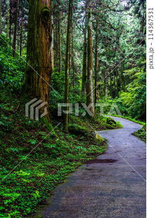鞍馬寺,引道上有美麗的新鮮綠色植物和透過樹木的陽光,垂直構圖 1