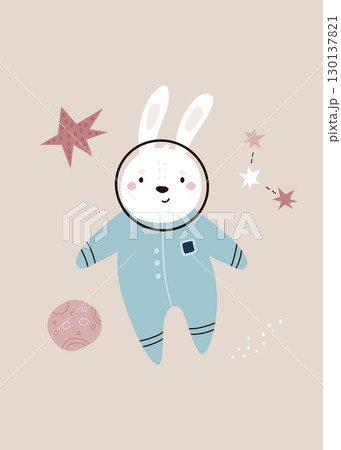 Rabbit Cute Astronaut Floating in Space with Stars and Moon