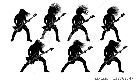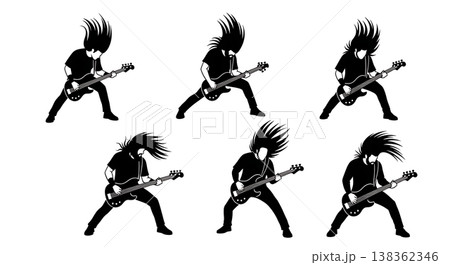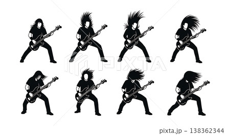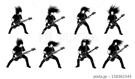 Black Solid Metal Bassist Silhouettes Set of Six on White Background