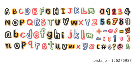 Vintage ransom note alphabet set with cutout letters numbers and symbols hand drawn vector illustration for punk grunge zine and anonymous poster design