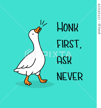 Funny cartoon goose honking with head up and phrase HONK FIRST, ASK NEVER on teal background
