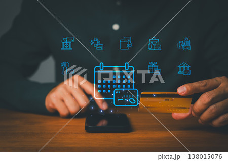 Man manages online payment and subscription with credit card and smartphone. Digital wallet icons for shopping, banking, and finance show a mobile lifestyle and calendar plan.