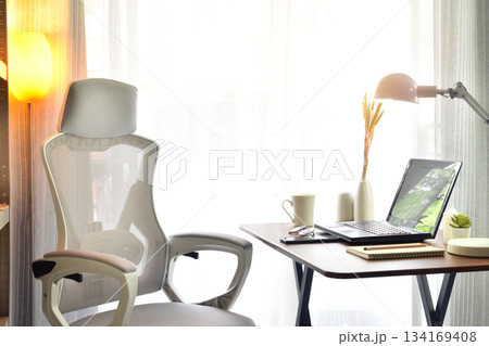A modern PC computer blank screen mockup is on a table in a modern minimal home office. 3d render illustration