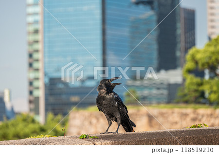 一隻烏鴉(大嘴烏鴉)在炎熱中喘息