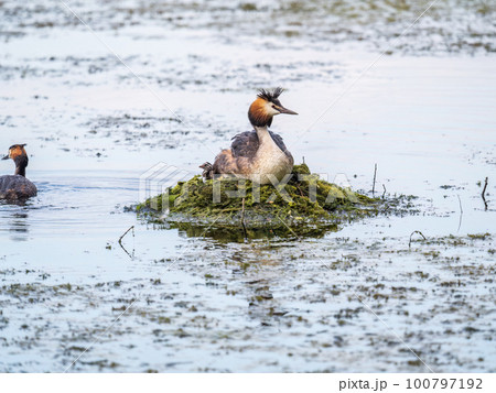 A pair of water birds, Great Crested Grebe, feeding chick at nest.