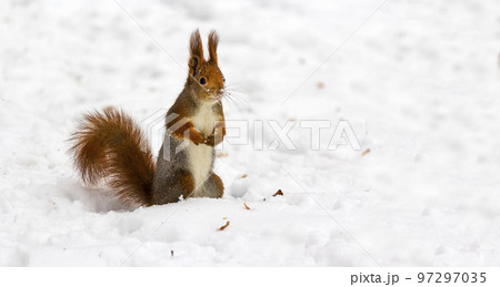 A cute red squirrel sits in the snow with a beautiful blurred background in the background