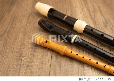 木桌上有三支豎笛:中音豎笛、女高音豎笛和超高音豎笛