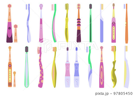 Toothbrushes concept collection in flat cartoon design. Different types and colors of toothbrushes set isolated elements. Cleaning tools for mouth. Dental hygiene and oral care. Vector illustration