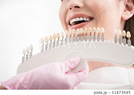 dentist choosing tooth color for patient at clinic