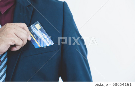 A businessman in a blue suit get a leather key bag from the pants. Defocused car on the background. Close-up of the hands. The concept of style and fashion