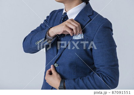 A businessman in a blue suit get a leather key bag from the pants. Defocused car on the background. Close-up of the hands. The concept of style and fashion