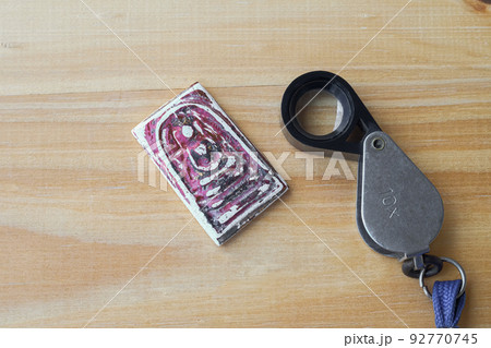 Magnifying glass for see the buddha Somdej amulet on wood table Background.