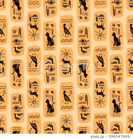 Ancient Egypt elements seamless pattern. Historical or cultural symbols. Wall paintings. Traditional Egyptian hieroglyphs. Old inscription. Sacred animals. Garish vector background